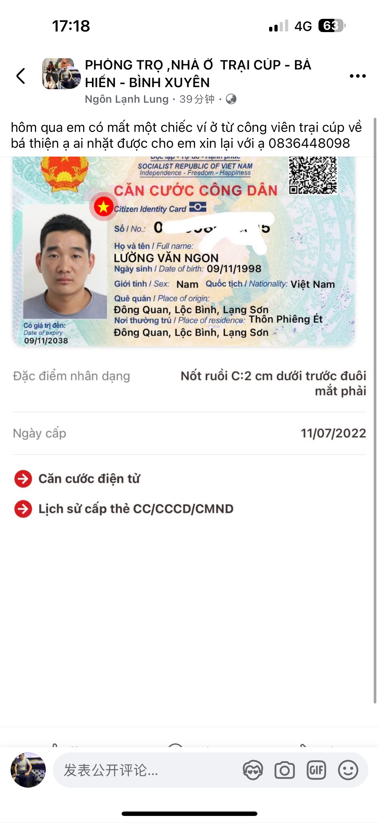 từ công viên trại cúp em làm rơi một chiếc ví có cccd như ảnh trên 0836448098, Vĩnh Phúc, Huyện Bình Xuyên
