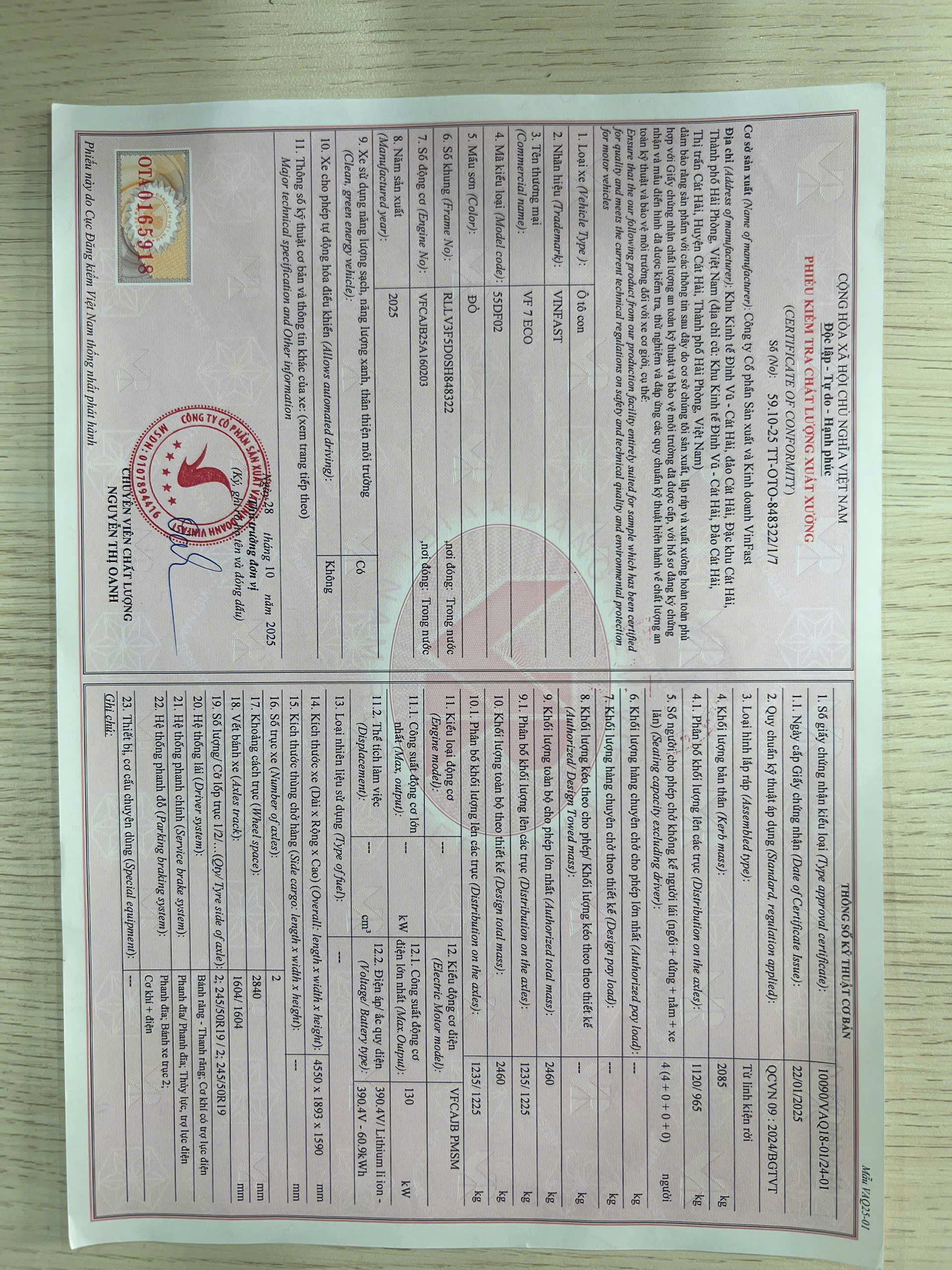 mất giấy xuất xưởng ô tô vf3 màu xanh lá và màu hồng